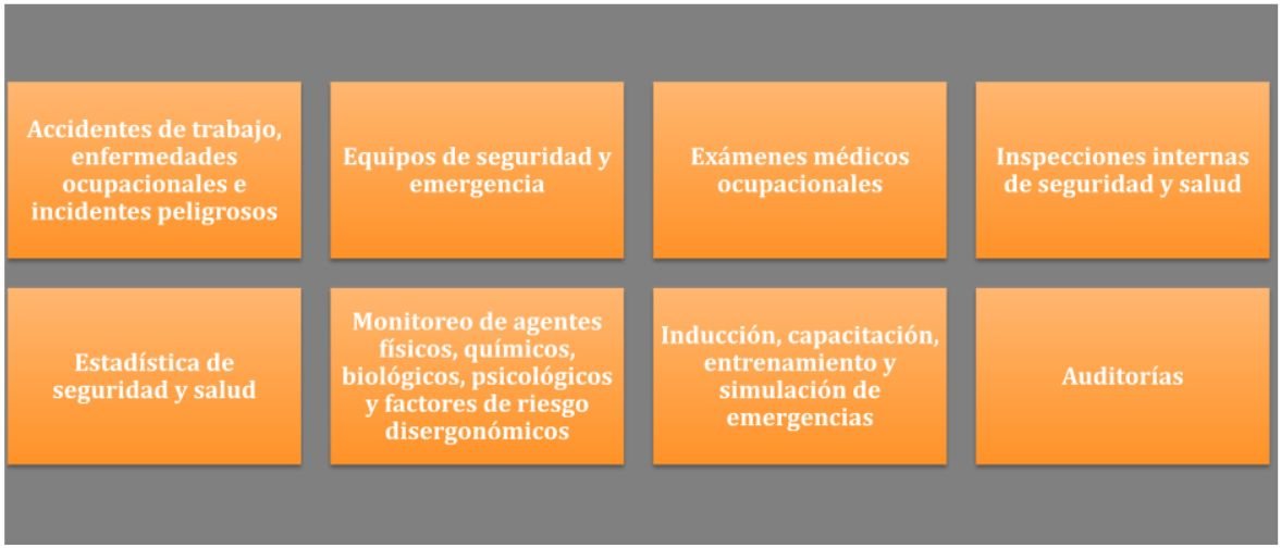 El RISST, por ejemplo, debe incluir objetivos y alcances, liderazgo, compromisos y política de SST, atribuciones y obligaciones, estándares de seguridad y salud en las operaciones, estándares de seguridad y salud en los servicios y actividades conexas, preparación y respuesta a emergencias en el caso de un siniestro.