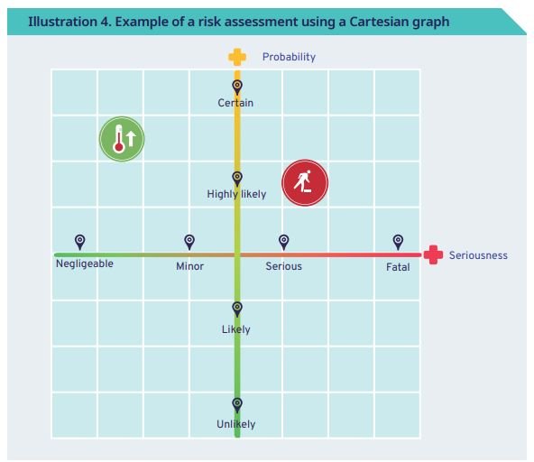 Acerca de la evaluación del riesgo en la industria cafetera, esta se aplica en función de la probabilidad de los peligros y riesgos identificados previamente (accidentes y enfermedades profesionales) y de la gravedad (gravedad) de sus consecuencias.