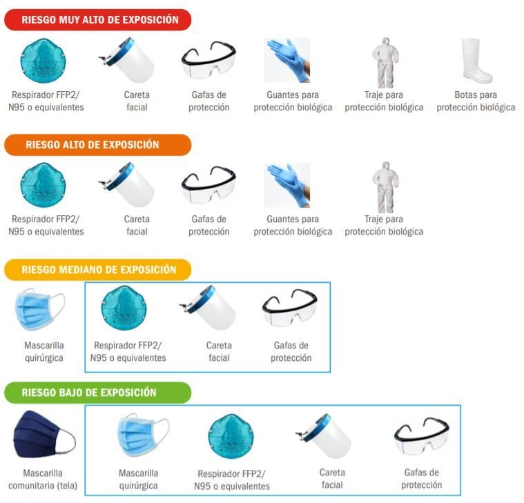 Los equipos de protección personal a utilizar dependen del riesgo de los puestos de trabajo para exposición ocupacional a COVID-19.